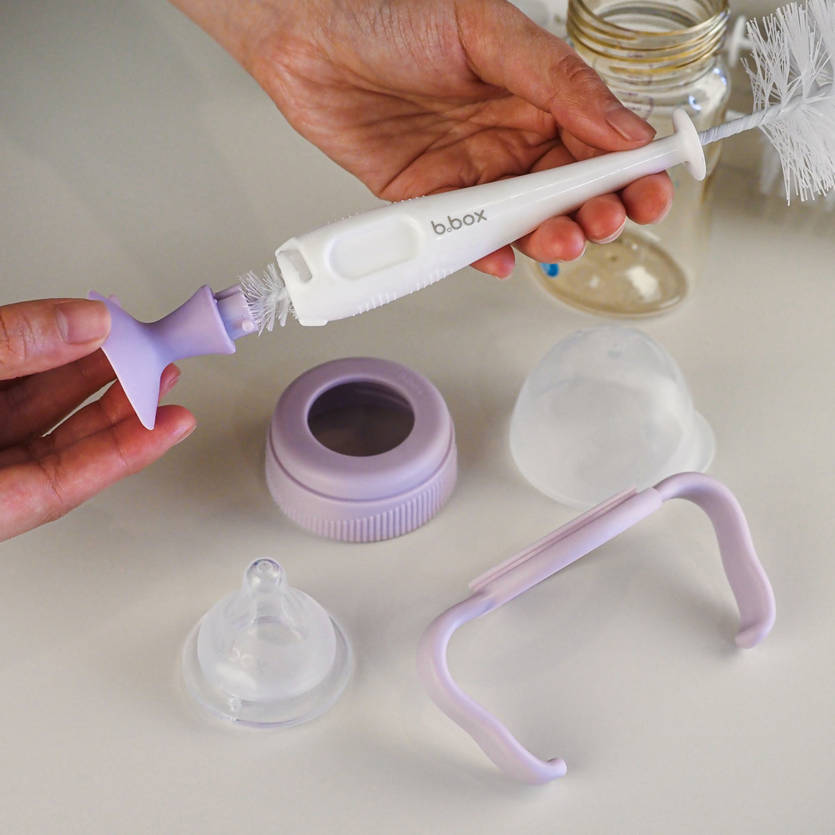 Make your b.box bottles and cups sparkle! The 2-in-1 bottle brush features a full-size brush with sponge tip for cleaning hard-to-reach areas and a teat brush conveniently concealed within the handle. The suction base attaches to a clean, flat sink or benchtop for hygienic air-drying or storage.