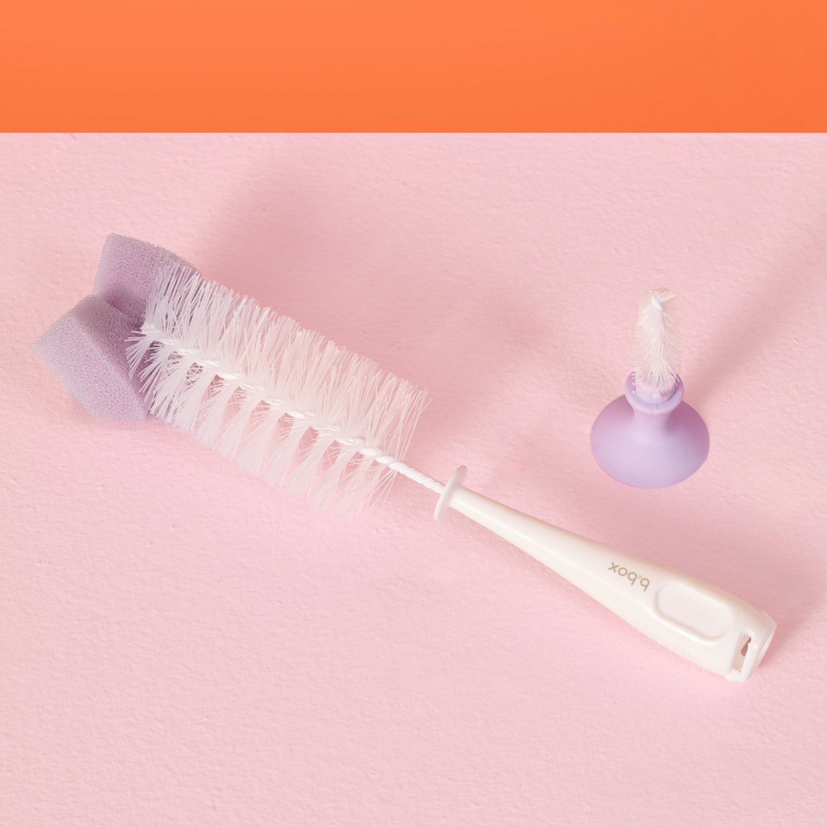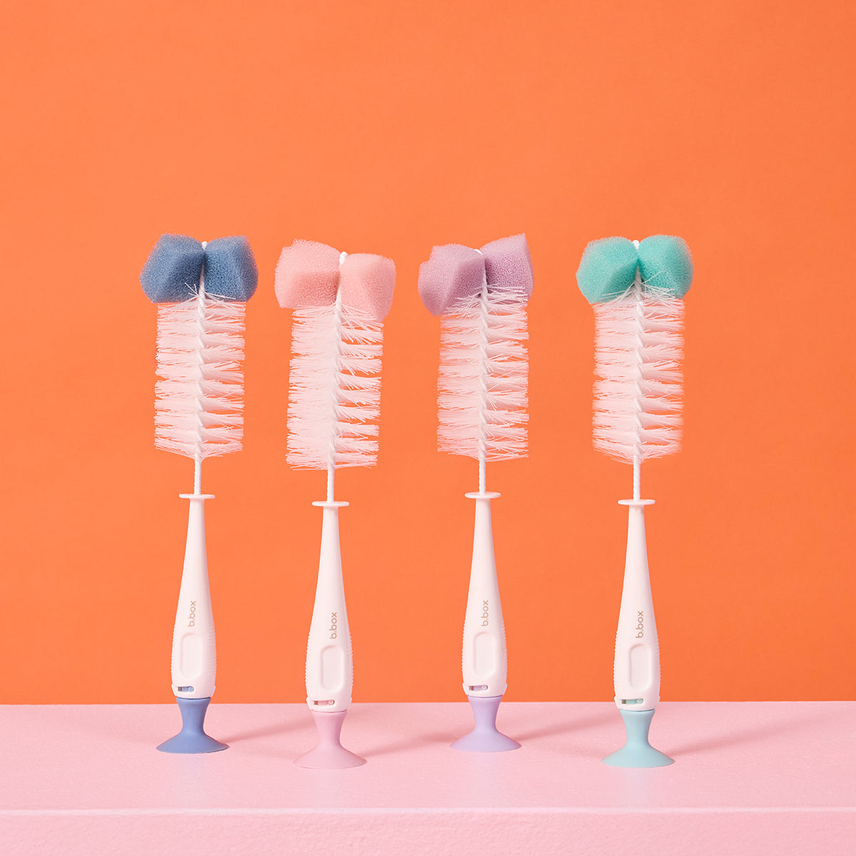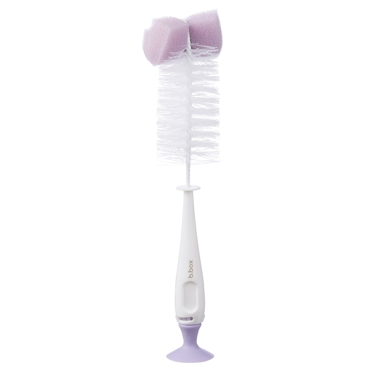 Make your b.box bottles and cups sparkle! The 2-in-1 bottle brush features a full-size brush with sponge tip for cleaning hard-to-reach areas and a teat brush conveniently concealed within the handle. The suction base attaches to a clean, flat sink or benchtop for hygienic air-drying or storage.