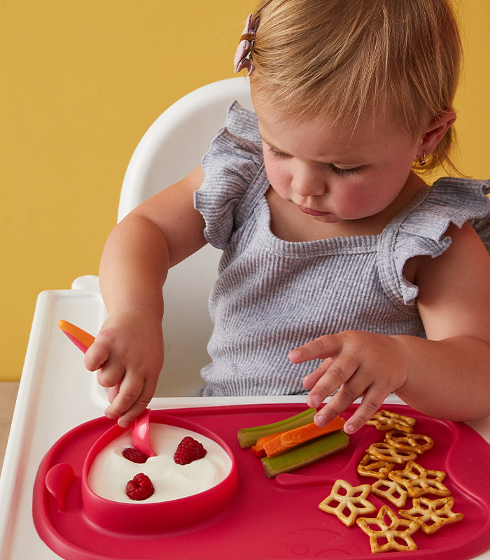 - Silicone loop secures rolled mat in place for feeding on-the-go