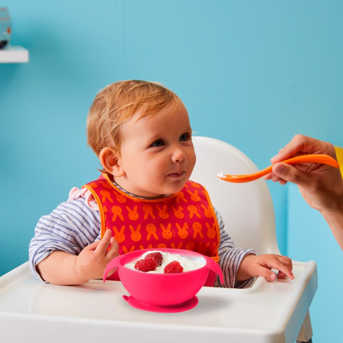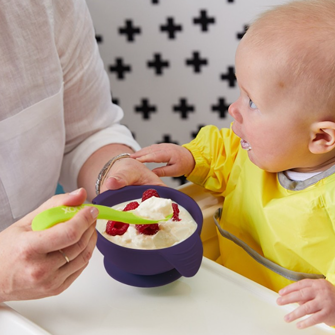 Meet the silicone first feeding set, a solution for less mess during toddler mealtimes! Includes a suction bowl and soft-bite flexible spoon.