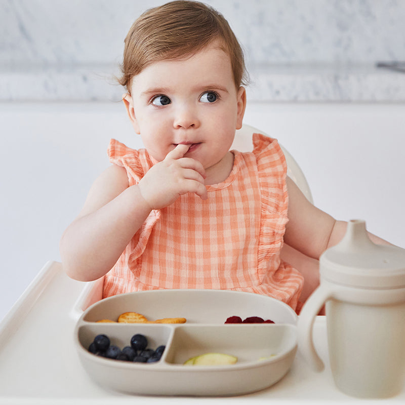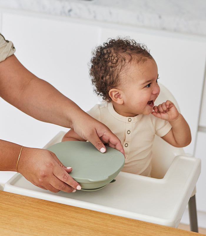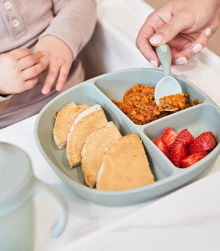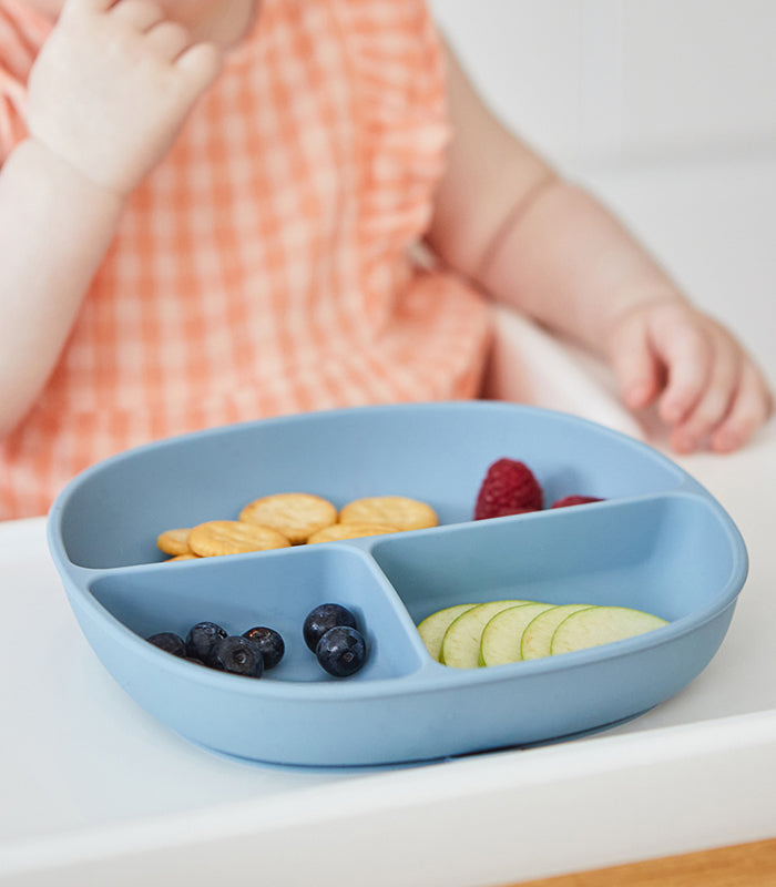 Divide, stick, snack and seal. Our platinum silicone suction plate + lid is a mealtime must-have for transitioning babies and toddlers to independent eating. Designed for convenience, functionality and style!
