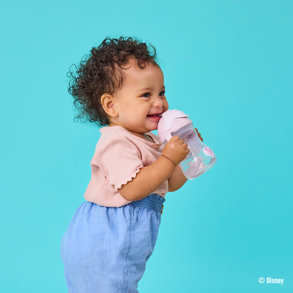 New Mickey and Minnie sippy cups bring a sprinkle of Disney magic! Our award-winning sippy cup features an innovative weighted straw that adapts to any angle, preventing leaks with a two-way valve, even with warm liquids. The ideal transition from bottle/breastfeeding to cup it supports independent drinking, allowing tots to drink to the last drop. With easy-grip handles and a flip-top lid, it's perfect for home or on the go. Available in soft pastel colours.